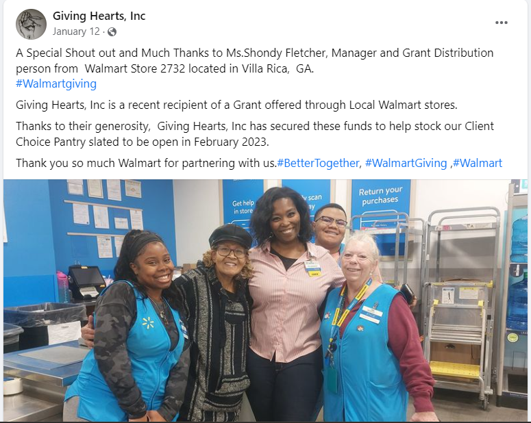 Giving Hearts presented a project for funding. The proposal was to help support grandparent's “Hunger Needs within their immediate household.” Upon observation, many Seniors were raising Grandchildren on a limited income. The Pantry became a welcomed relief providing “kid-friendly” food items. Based on budgetary restraints, the supplies of children-centered foods were limited to the shelves. The funding from the grant was utilized to specifically purchase additional food that met the criteria for this category.